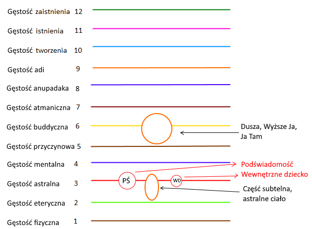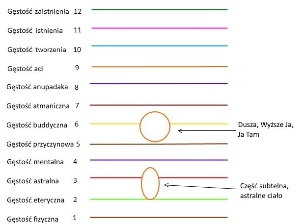 Często jasnowidzom, szamanom czy osobom w stanie głębokiej hipnozy wyższe gęstości – przyczynowa i buddhi – wydają się wibrować wyżej i być bogatsze w formy niż niższe poziomy (eterczny, astralny, mentalny). Istoty tam rezydujące sprawiają wrażenie mądrzejszych, bardziej przebiegłych, ponieważ mają do dyspozycji szerszy wachlarz cząstek i możliwości.