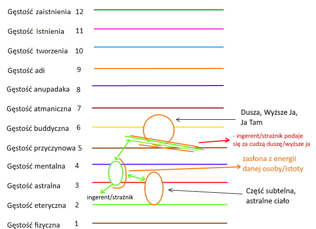 Oprócz ciał subtelnych człowieka, w przestrzeni wokół nich często obecne są byty/istoty o różnym pochodzeniu. Najczęściej spotykane to jaszczury (reptile), szaraki, hybrydy, drako. Jasnowidz, szaman, terapeuta, pragnąc nawiązać kontakt z duszą człowieka (a nie jedynie z jego częścią subtelną), często napotyka przeszkodę – przygotowany ingerent (widoczny na zielono na naszym wykresie) podszywa się pod przewodnika, skanuje częstotliwości, tworząc w sobie zasłonę wibracji identycznych z badaną osobą. Istoty, zwłaszcza jaszczury, potrafią imitować anioły i archanioły, by ułatwić sobie dostęp.Ta technika manipulacji polega również na podawaniu się za przewodnika, opiekuna, wyższe ja danej osoby.