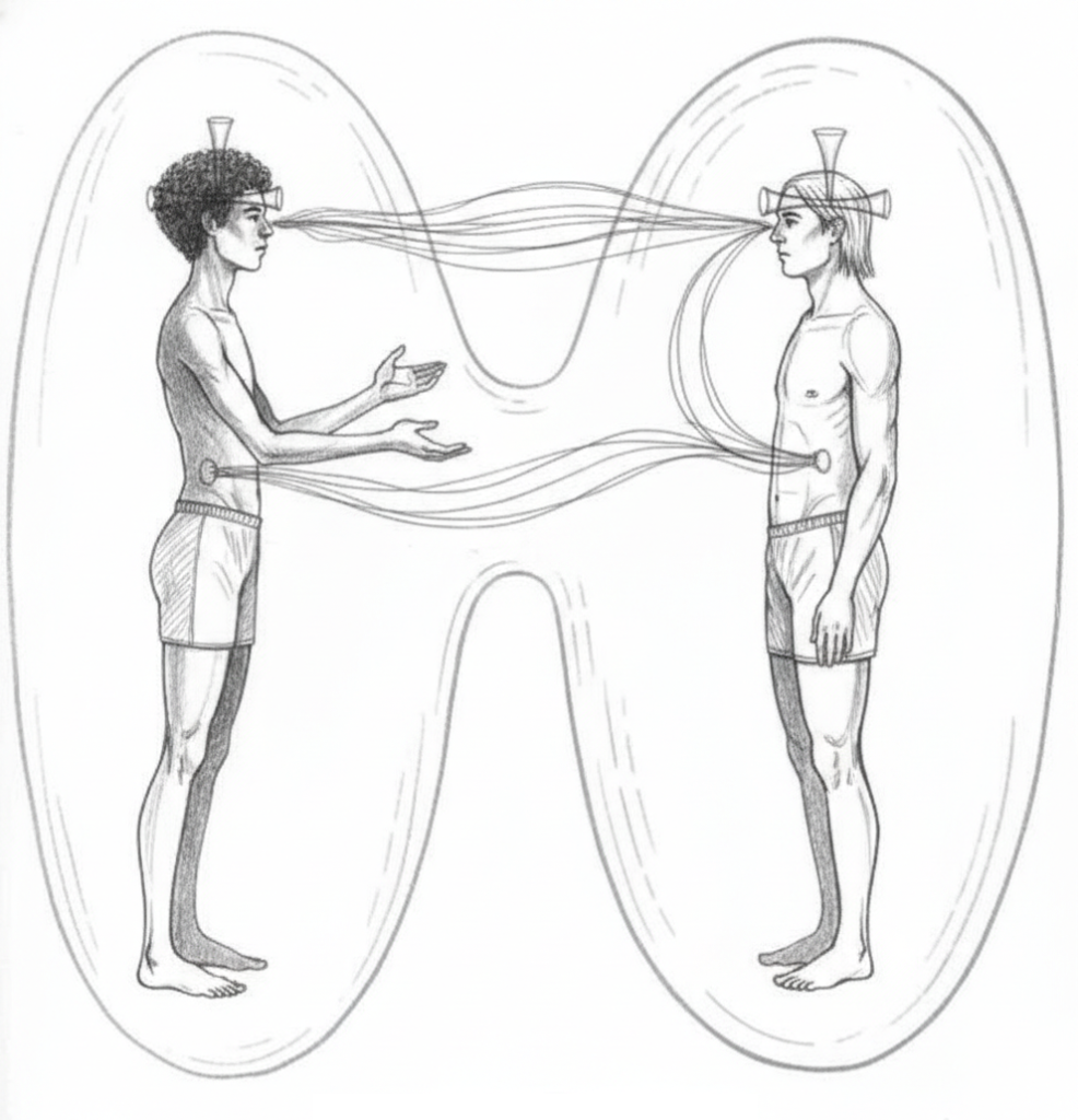 Osoba po lewej próbuje wejść do czakramu osoby po prawej. Udane podpięcie umożliwia wyciągnięcie energii. Osoba po lewej może teraz wpływać na emocje i zachowanie drugiej osoby, modulując je.