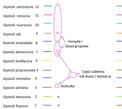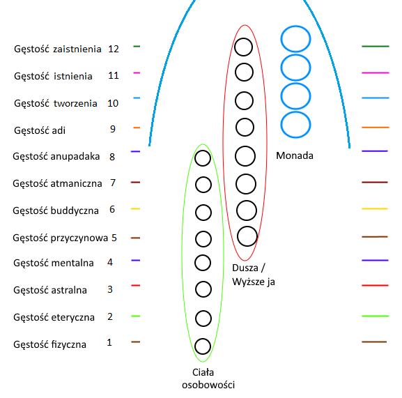 - Dusza: ciała przyczynowe, buddyczne, atmaniczne i anupadaka.