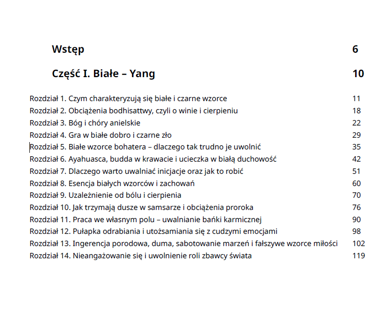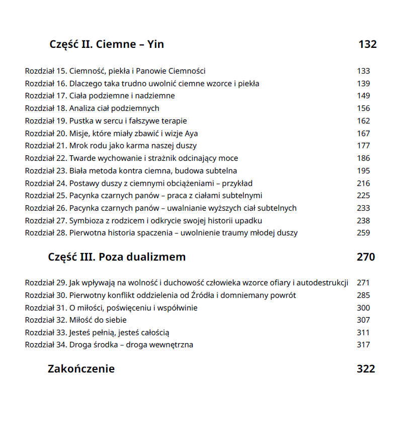 Mimo ogromu wiedzy i nauki, jaką przyswajamy, zgłębiając kolejne rozdziały, wcale nie czujemy się przytłoczeni. Wręcz przeciwnie – czujemy się jak kwiat na łące podczas ciepłego poranka. Jaki jest najważniejszy element terapii? To, co nieuświadomione, ukryte w cieniu, zepchnięte, ocenione i zdegradowane, nagle wychodzi na powierzchnię i zostaje przyjęte. W ten sposób staje się naszym zasobem. Jung mówił o złocie zakopanym w cieniu. Jednak nie jest to w pełni możliwe, jeśli nie rozumiemy białych i ciemnych wzorców, białych i ciemnych sił – wszystkiego, co w mistrzowski, a zarazem manipulacyjny sposób, utkane jest w naszej ziemskiej, dualnej rzeczywistości.
